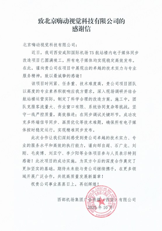 近日,嗨动视觉收到来自西安咸阳国际机场发来的感谢信,其T5航站楼电子媒体同步改造项目获客户高度赞誉,核心肯定团队专业技术素养与高效执行能力。该项目不仅彻底攻克显示终端长期播放不同步的行业痛点,更以定制化技术方案与稳定运行表现,赢得客户深度信赖。