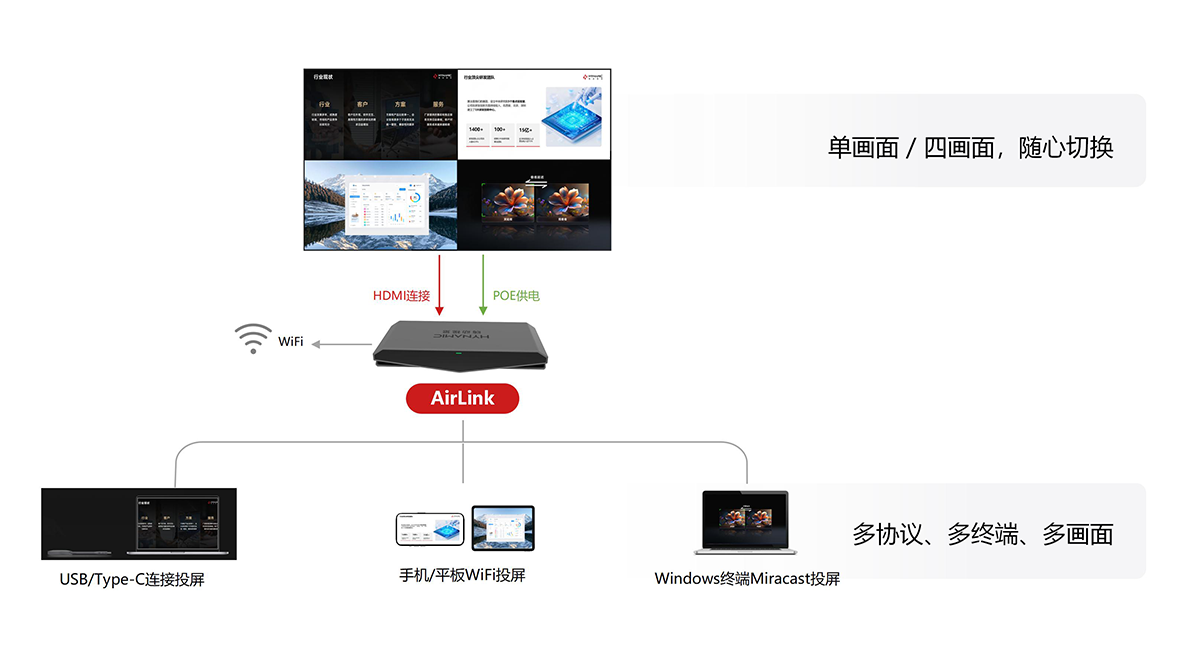 专为企业会议室高效协作设计,配备USB和Type-C双接口,无需安装驱动,即插即用,无感极速投屏。真4K@60Hz惊艳输出,画面细节清晰可见,纵享原生画质。60ms无感延迟,操作极致流畅,尽享丝滑体验。支持四画面同时分享,全屏/多画面极速切换,会议决策更高效。全协议覆盖+多系统兼容,电脑、平板、手机等设备随心切换。广泛应用于商务办公、教育教学、家庭娱乐等场景。